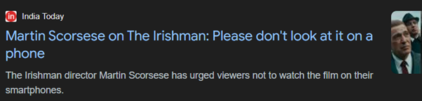 Watching a film on mobile phone can be considered inconvenient, not giving the right attention by being distracted with notifications, battery power, insufficient amount of light, night light mode, and of course, a much smaller screen. On the other hand, it brings cinema everywhere, screen can be recorded for sharing and it is much easier to rewatch a scene again. From these pros and cons, Scorsese chose to recommend not to watch the film on smartphones. I think it is not necessarily because of technological advancements but because of traditional approach. If we are getting distracted too often, not surrounded by sound, and the screen is something like 100 times smaller than TV (or 12,500 times than theatre screen)- watching on a smartphone screen is just against the vision of the perfect experience.
