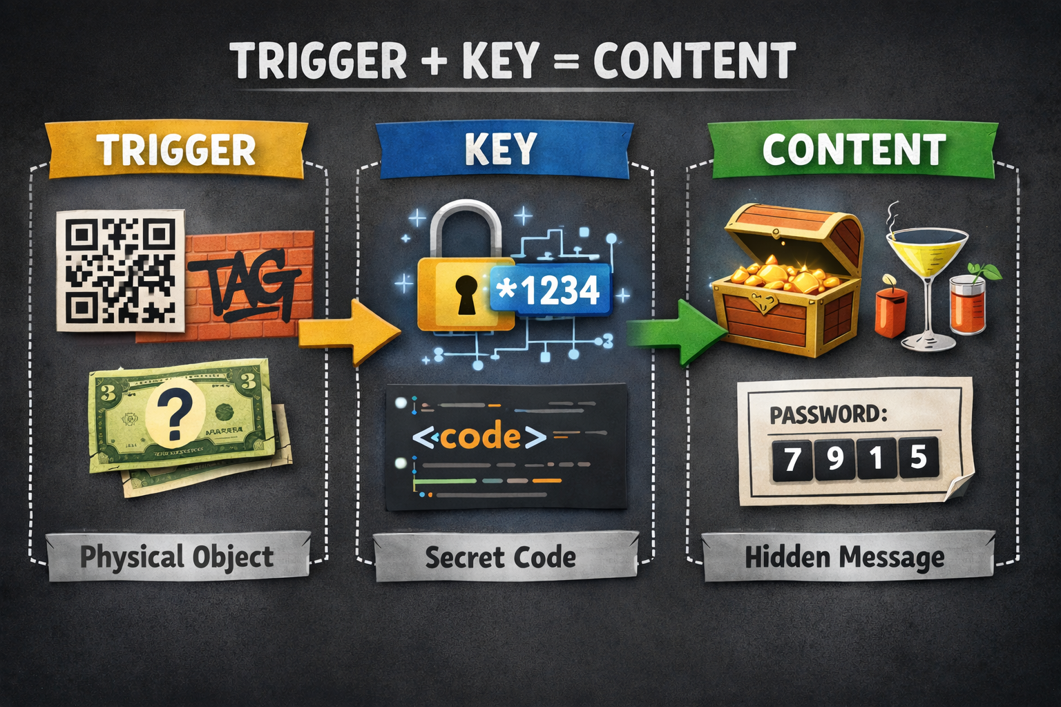 In fact, the system consists of three parts: the trigger, the key, and the content. The "trigger" can be any object in physical space, for example graffiti, a bus timetable, or money. The "key" is the code that links the seemingly innocent object to the content, and it does not necessarily indicate which object should be scanned. The content is the content itself, potentially something secret: instructions for preparing a popular drink, the location of a treasure, or a computer password. Minimal traces. Only the combination of the trigger and the key leads to the hidden content.
