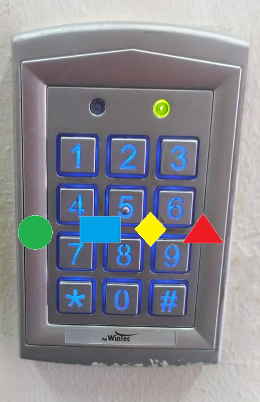 Anyone with experience in escape rooms or puzzle games would immediately understand that, in order to enter, four objects must be found to form the code. The colors and shapes hint at the sequence of inputs on the keypad (a green circle, followed by a blue rectangle, and so on). But how are the numbers themselves found? By searching the surroundings for objects to scan according to the colors, and by following hints from Jaguar: