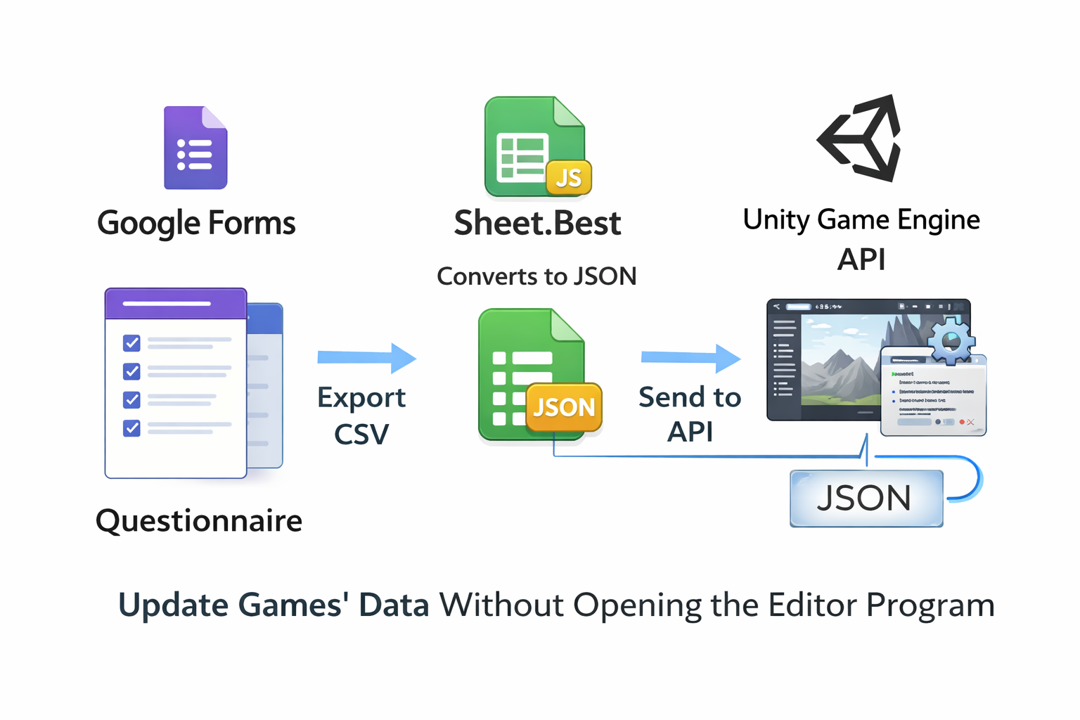 The pipeline for making this function includes creating a questionnaire in Google forms as a CSV file, converted by Sheet.Best to JSON file, which can be used in an API inside Unity Game Engine. Using this technology, it is possible to update games' data without opening the editor program.