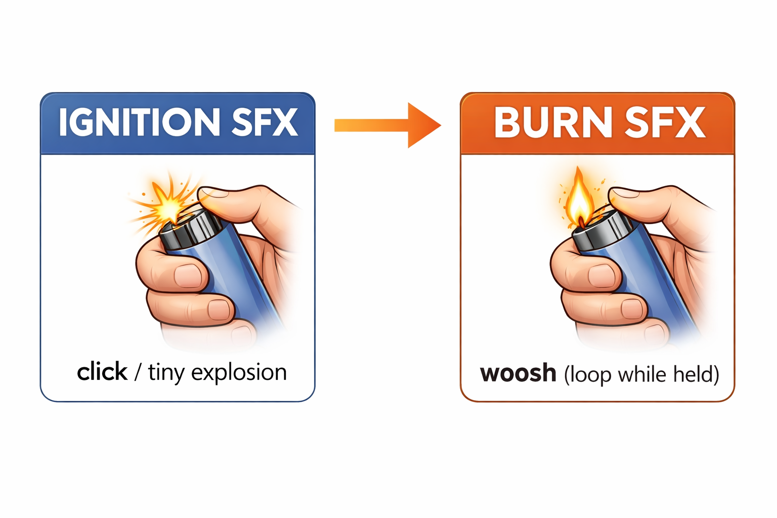 The sound of a lighter is also something to consider- every lighter trigger produces a clicking sound that will happen at the beginning of every ignition (sounds like a tiny explosion) followed by a "woosh" of the burn. As long as we hold the trigger, this sound will play. This audio detail requires a unique script differentiating the ignition and burn sound effects.