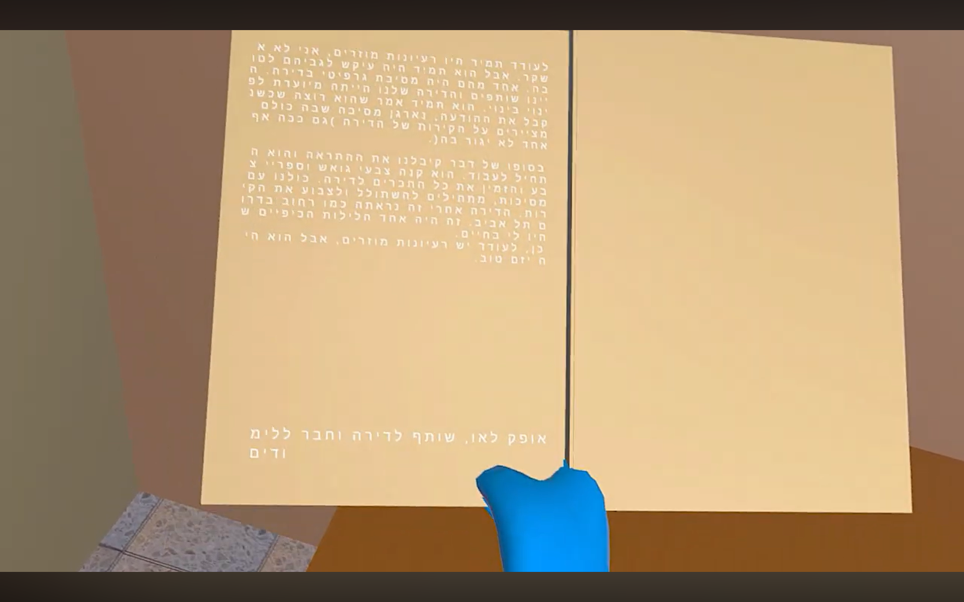 In the project, there are several items that are played when grabbed. If we grab the official life story document written by the Ministry of Defense, we can hear the voice of radio host Dan Kaner reading it. As long as we hold the document, he continues. When we pick up the object again, we will hear the document from the top. If the visitor wants to get to the end of the document, they need to slow down and to hear the whole story. Anyone who seeks to rush things up will miss most of the experience.