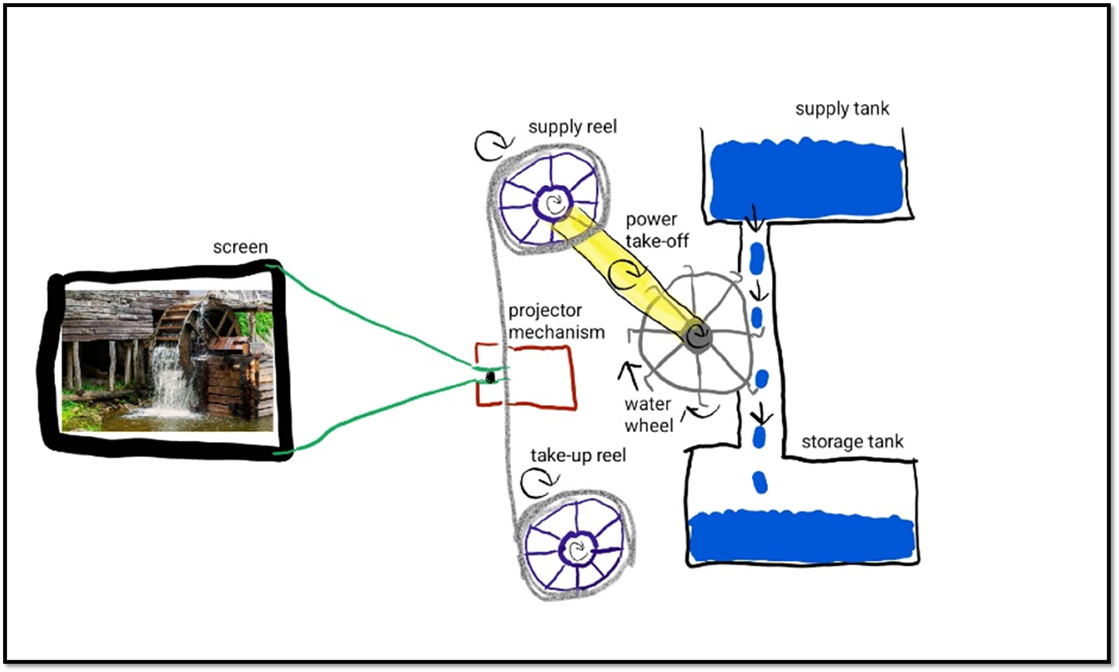 Hydro-power is the only renewable energy that is stable enough over a period of any given 2 hours. Solar energy cannot produce at night, a favorite time for film-watching; wind power is unpredictable and unstable; nuclear isn't safe next to an audience. Hydro-power can simply mean that a container of water is being flushed down for 2 hours to another container, and in between there will be a water wheel that will spin. That spin can transform into spinning the film-reel set (supplier and taker).