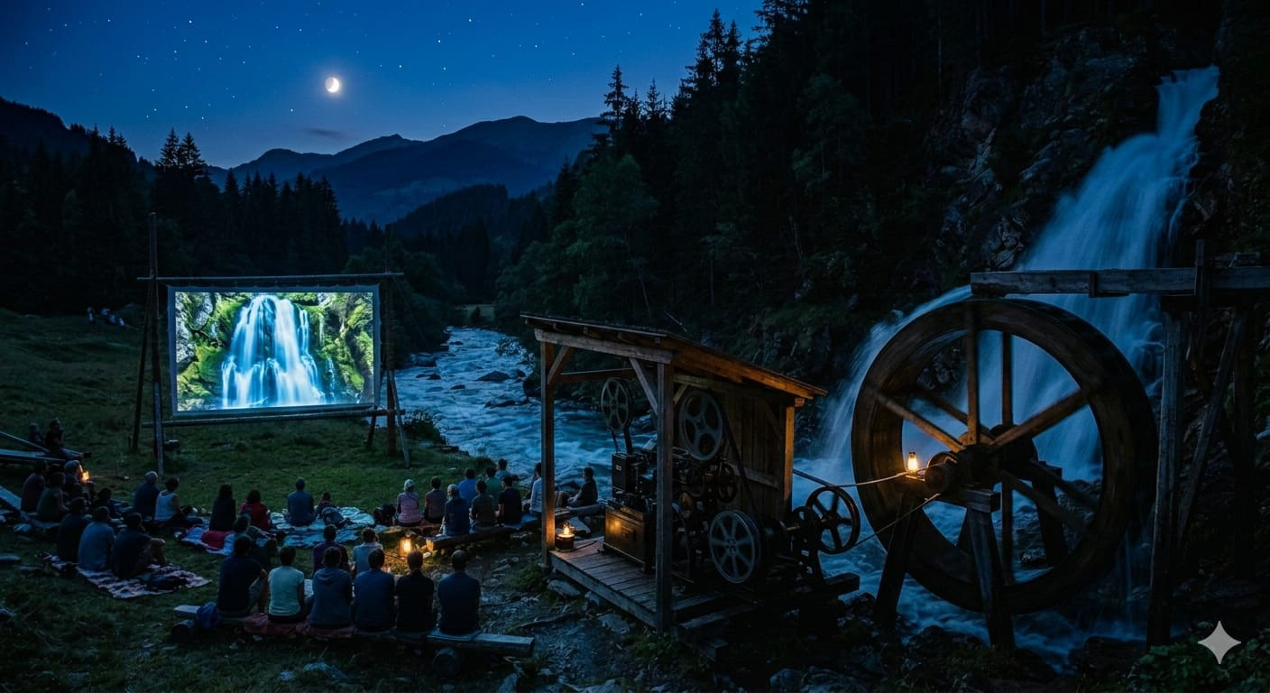 Hydro-power is the only renewable energy that is stable enough over a period of any given 2 hours. Solar energy cannot produce at night, a favorite time for film-watching; wind power is unpredictable and unstable; nuclear isn't safe next to audience. Hydro-power can simply mean that a container of water is being flushed down for 2 hours to another container, and in between there will be a water wheel that will spin. That spin can transform into spinning the film-reel set (supplier and taker).